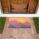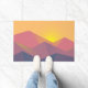 山の背後に輝く黄色い日差しを持つ山の頂上が多く見られるグラフィックイラストレーションのドアマット。幾何学的な多角形の形状で作られた。シンプルデザインミニマル。色はダークブルーからデザートレッドまで。