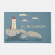 海辺のパーソナライズされたコテージや他のビーチハウスに最適。赤とクリシンプルーム航海のまたはアイボリーの灯台のスタイルイラストレーションがある。灯台は岩の多い岸辺に立ち、波が打ち寄せ、クリーム色の雲が空に浮かぶ。グラフィックはソフトブルーの背景にフランスの設定される。