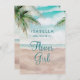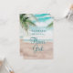 南国をイメージしたビーチの風景。波打つ海、砂浜、ヤシの木が立ち並び、美しいターコイズブルーの空。モダンなタイポグラフィのスクリプトフォントを使用。夏のトロピカルビーチやデスティネーションウェディングにぴったり - オーダーメイドのウェディング 花嫁の花を託したい プロポーズカード