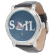 ダークブルー文字デザインの背景に帆船の装飾と帆イラストレーション。背景の色を変更し、選択した違う状態でデザインに追加できる。