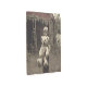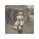 子ども幽霊は、放置されたヴィンテージサーカスのテントが残っている森でテディベアを保持する