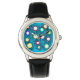 この時計は、青のフィールドに違う線が外れている色の円の幾何来的なデザインを持っている。