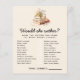 お祝いに笑いを加える彼女はむしろ – 新しい章がブライダルシャワーゲームを開始!花嫁インスパイアの次の大きな章では、このおもしろいとインタラクティブなゲーム招待状は、コーヒーやワインからビーチの日や映画の夜まで、花嫁が何を選択するかを推測する。本をテーマエレガントにしたデザインの要素とカスタマイズ可能なプロンプトで、それは完全に任意の文学的または"新しい章"ブライダルシャワーテーマを補完する。プリントやディスプレイへの簡単素晴らしは、氷を壊して誰もがお祝いに関与する方法である。あなたの魅力的ブライダルシャワーゲームラインナップに追加!