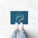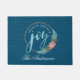 ピンクのポインセチアとガーランドを備えた休日のリースのグラフィックを特徴とす飾る、この美しいクリスマスのドーマット。リースは、微妙なドットパターンとダークブルーの背景に休日の挨拶「心地よいと喜びのタイディング」でアクセントを付けている。「喜び」という言葉が手書きのスタイル文字に人気がある大きく現れる。