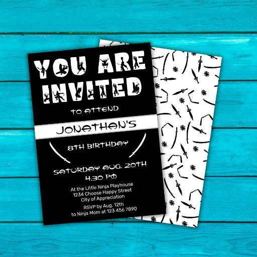 あなたの人生の中で忍者の子供のための思い出クールに残るおもしろい誕生祝いを作成する。この簡単にカスタマイズ可能な誕生日パーティーの招待は、一致する誕生日パーティーのアクセサリーのセットの一部である。小さな武術アーツ愛好家のための最高の忍者をテーマにした誕生日パーティーをホストすることができる。自分の詳細を追加しカスタマイズて、パーティーのプレート忘れ、カップ、ナプキン、およびすべての必需品について考えてはいけない。このデザインは白黒クールの忍者と忍者シルエットタイポグラフィを備えている。