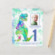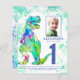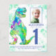 恐竜を愛する男の子のために。この轟音Tレックス招待状Dinoファンにおもしろいの1番目の誕生日パーティー。予算の招待。このカラフル水の色スプラッシュブルーとグリーン最初の誕生日の招待状をパーソナライズ誕生日の少年の写真と誕生日の数とパーティー詳細と一緒におもしろいパック恐竜テーマのdino誕生日のために設定されている。すべての恐竜の種は歓迎される。美しいユニークオリジナルのアートワークby artist Catherine Sweetman