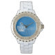 青と白の(ユダヤ教)メノラーをイメージした女性のライン淡い色のストーンの白いエナメル時計は、青と青のデビッドの星をトッピング。対応する四角ボタン、四角いチャーム、長方形の両面アクリルのキーチェーンを参照。HOLIDAYSセクションのACCESSORIESカテゴリの下にあるHanukkah Watchコレクション全体を参照。