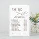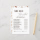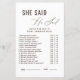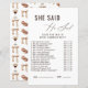 祝ブライダルシャワーと一緒に新婦と彼魅力的はゲームと言った!ゲストは楽しむ、これらのおもしろいと幸せなカップルに関する洞察力のある質問で誰が何を言ったか、または何をしたかを推測する。美しいワイルドフラワーのデザインを特徴とし、このゲームはあなたのブライダルシャワー祭りに完璧な追加である。思い出に残る瞬間を生み出しながら、新郎新婦についてもっと知る楽しい方法だ。おもしろいを始め、夫婦を知っている人を見最高のよ!