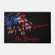 米国の花火に似た旗を備えたドアマットで自宅へようこそお客様を歓迎。「ようこそ」とあなたの家族の名前は赤いスクリプトフォントにある
