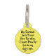 この犬のためのペットラベルは黄色の背景と未知の作家による短い詩を持つ:私の太陽は空から来し、私の犬の目の愛から来は。編集デザインを使って、犬の名前や情報をラベルの背面に追加できる。フォント/背景色も変更できる。