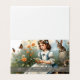 青いドレスに白いラッフルを着た若い女の子が、開花園の真ん中にある木製のベンチに座っている。蝶が飛読ぶ間、彼女は小さなカードのまわりにである。ウサギと小さなウサギが彼女の隣に座り、他の春の花開花は暖かい色で背景に。"ハッピーイースター"という言葉与えは写真フェスティバルtouch。
