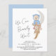 銀の月の上に座って青いテディベアの可愛い水色のイラストレーションと花模様とパンパスグラスのベージュとテラコッタのブーケを特色にしたボホバジェット男の赤ちゃんカップルのシャワー招待と手書き書きスクリプトで"私たちはBearly待つことができフレンドリーる。親の名前とシャワー詳細の名前を追加シンプルタイポグラフィ。