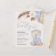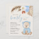 可愛いテディベアの水彩フレンドリー、トープ、青とテラコッタパンパスグラスと花模様のブーケ、そしてタイポグラフィと青いスワッシュスクリプトのミックスで「私たちはBearly Waitシンプル」を特徴とするボホの予算男の赤ちゃんシャワーの招待スタイリッシュ。
