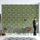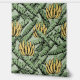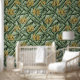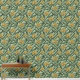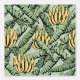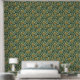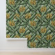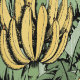 手描きの黄色いバナナのバンチと黒いインクの離れを特徴として、クロスハッチのディテールを持つエキゾチックな大規模な壁紙。緑のエレガント背景は、緑の明るい色合いの雨滴の微妙なパターンを特徴とする。パターンサイズは24インチ×24インチ
