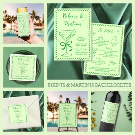 「ビキニ&マルティニ」の招待で究極のバチェロレッテ週末にダイビング!このトレンディーデザインはお洒落、鮮やかな緑のトーンで手で描いたドードルとマーティーニ眼鏡の落書き、シックな弓、ビキニ、サングラスを備えている。ビーチサイドのbashやプールのパーティーに最適なよくはしゃぐイラストは、忘れられないお祝いのシーンを設定する。招待には、すべての人がループに留まることを保証するための詳細な週末の旅程が含まれている。あなたはプールでラウンジを歩いたり、街で一番ホットなスポットを訪れたりしても、新郎新婦の特別な週末の興奮と喜びを感じることができる。チームを集めて、スタイルに向けて準備を整え祝て、バチェロレッテの週末のあらゆる瞬間を忘れられない思い出に導く「ビキニス&マルティニス」の招待状を受け取る。