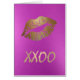 あなたの家族に挨拶状を見るこのおもしろいのピンクホイルが付いているキスそして抱擁を送って下さい。 金ゴールドのきらびやかなキスの唇のプリントのグラフィックはXXOOを読むゴールド・トーンの写実的な文字と共に前部を飾ります。 ほしいと思うものが読むためにショッキングピンクの文字を、カードの中で、個人化して下さい。