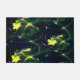 黄色がかったつる植物の葉に似た形状の派手なバーチャル画像が、非常に暗い緑の背景の上に、薄い黄金の金属の層を参照する色のエッジで。
