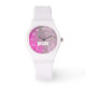 紫、白と明るいピンクの女の子グラフィックスポーティな抽象芸術時計。自分の名前でパーソナライズ。Sarah Trettによインスパイアり、オーストラリアのインバロック州のビーチとサーフィンから設計。