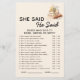 スマイルと甘い驚きを持ってブライダルシャワーに彼は言った、彼女は言った – 新しいチャプター本の版。ブライダルシャワーのテーマに合わせて作られたゲームで魅力的は、おもしろいに関する質問やよくはしゃぐ引用文を取り上げ、新郎新婦が言ったかどうかを推測する。本のグラフィックエレガントスとカスタマイズ可能な文字を備えインスパイアて、本を愛する花嫁やロマンチックなストーリーテラーのための完璧なアイスブレーカーである。ブライダルシャワー、婚約パーティ、リハーサルのディナーに理想的な、この印刷可能なゲームはあなたのお祝いに思慮深く、軽いtouchを追加する。