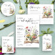 このデザインは、右側に繊細な水彩画のイラストが施された開いた本を特徴とし、ページから柔らかな花が咲き出しています。 これは、結婚式を控えた花嫁にとって美しい新しい章の始まりを象徴しています。 夢のような花、暖かい色、そして優雅なレイアウトが、魅力的で歓迎すべき雰囲気を作り出し、本好きな人やロマンチストにぴったりです。 文学やガーデンにインスパイアされたブライダルシャワーに最適なこの招待状は、記憶に残る有意義な祝賀会の舞台を設定します。 デザインに関する支援が必要な場合は、Zazzleチャットでお問い合わせください。 12時間以内に必ず返信させていただきます。