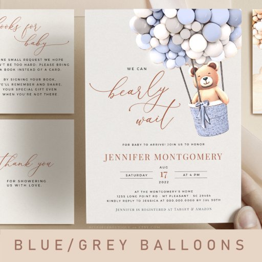 早く待てよ!:)この小さなクマは大きなベビーパーティーを待っている、青、茶色、クリームの風船から作られた熱い気球に座っている。水お洒落色とモダンタイポグラフィはデザインを補完する。ベビーシャワー招待状を簡単かつ迅速にカスタマイズしカスタマイズて、ボタンを押して文字のスタイルと配置を再配列し、フォーマットすると、ベビーシャワー詳細。