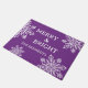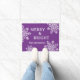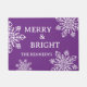 フェスティバルの休日のメリーdoormatと明るいタイポグラフィ、紫の背景に白い雪のパターン。ファミリ名でパーソナライズ