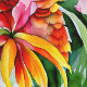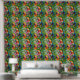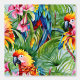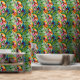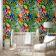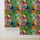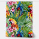 赤かわいらし色、緑、青と黄色の水色のパロットと熱帯花と植物のシャワーのカーテン。