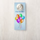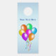 紙ドアハンガーは、明るい青色の背景にマッチ違うのストリーマーと色の多い色の明るい色のバルーンの束を持つつる。前カスタマイズと後ろのテキストとテンプレート。