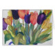 空白のなメッセージカードおよび赤く、オレンジ、黄色のこれらのチューリップの花を特色にする挨拶状青および紫色。 オリジナルの水彩画の絵画から作られる。