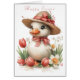 愛らしい、白いイースターダクリングかわいらし、花とピンクのサテンの弓を着てかわいらし、春、麦藁帽子。彼女はまた、彼女の首に暗いピンクの弓のまわりにを持ち、ダッフォジルとチューリップの満ちかわいらした庭に座っている。内側には可愛い挨拶とカラフル春の花のフィールドに座っているブンニー。