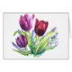 紫色の春のチューリップおよびバーガンディ、一握りの青い鐘との新しくおよび甘い、および忘れ私nots美しい花束を作るために加えました。 P.Allingam Carlsonの庭からの水彩画の権利。 カード。