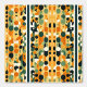 暖はっきりしたかいオレンジ、緑、黄色のトーンで円、ダイヤモンド、三角形を特徴とする幾何学的デザイン。左右対称のレイアウトは、壁モダンのアートやプリントに最適な美を作成する。