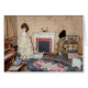 エレガントで旧式なミニチュアbisqueの人形はこの愛らしい寝室の設定のベビーを世話します。 このカードの内部は空白のです。