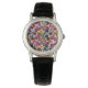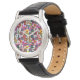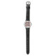 この女性時計は、明るい灰色のフィールドに茶色、黒、レンガ、黄色、ティール(緑がかった色)、緑、紫、金ゴールド、ピンク、赤、グレーの正方形の内部の正方形の幾何学的なデザインを持っている。