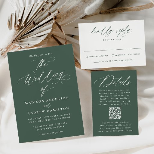 豊かな濃い緑の背景に優雅な白い書道を施した洗練されたRSVPカード結婚は、季節を問わず結婚式に最適で、インフォーマルなお祝いにも適していフォーマルる。タイムレスなデザインは、カップルが自分の回答日をパーソナライズし、洗練された外観結婚のためにはっきりした白いレタリングで彼らのウェブサイトを顕著に表示することをモダン可能にする。便利なQRコードはシームレスに統合されており、詳細やRSVPのオンライン結婚で簡単に自分のウェブサイトにアクセスできる。クラシックの魅力と利便性を組み合わせコンテンポラリー、このシックなRSVPカードは、結婚式の洗練された美意識を高めながら、ゲストの反応を合理化するための理想的な選択である。