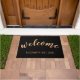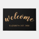 書道温パーソナライズされたかいおかえりです。新婚の人や新素晴らししい家の持ち主にアイディアを贈る贈り物です。こパーソナライズされたの歓迎ドアマットはシックで長持ちする黒。この黒いウェルカムドアマット機能は、手書きの書道スクリモダンプトの「ようこそ」ですエレガント。クラシックブロックレタリングで作成した姓名と年を使用してカスタマイズできます。