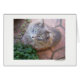 Max the cat 、灰色の子猫とライムグリーンの目の緑の植物の上に赤錆びたオレンジ色の石の上に座っている。