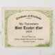 美しい8 1/2 x 11の優良賞認定証 最高の先生認定証に。木のぬくもりを感じるような森のスタイルの木版画プリントでデザイン。 この認定証には、先生の名前と年、学生の名前、学年、学校名が記入されます。 ご自身でフレームを追加(またはなし)して、この手頃な価格の認定証を、お子様の先生がいつまでも大切にできるギフトにしてください。