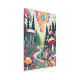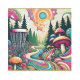 レトロユニークなキノコ、松の木、カラフルが渦巻く雲、青、緑、ピンク、オレンジなどのヴィンテージ色の太陽の光のフィールドのカラフルディスクゴルフコース。