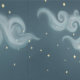 渦巻く雲に囲まれた様々な段階の月の夢のような描写。