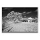 南のテキサス州牧場の納屋、木および塀の白黒赤外線写真。