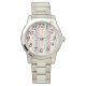 この女性時計は、白のフィールドにモダンティール(緑がかった色)、オレンジ、ビート、オレンジの長方形を繰り返す世紀半ばのデザインを持っている。あなたはもしデザインが好きだが、色違うを好む、メッセージ私。