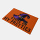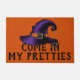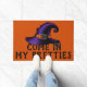 おもしろいハロウィン(または来いつでも)の言葉でフォーマット"私の前に"と紫の魔女の帽子と蜘蛛の端からぶらぶら下がっている。