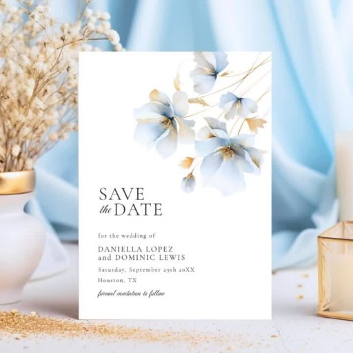 柔らかくエレガント繊細な水色のフローラワイルドフラワーデザインの紙ナ結婚プキン。パステルダスティ赤面ブルーと金ゴールド植物水色の色と洗う。年の任意の時間。春夏結婚の季節。編集する簡単テンプレート。一致するコレクション'DANIELLA'を参照