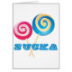 青とピンクの2つの棒つきキャンデーがお互いに交差している。文字読: Sucka.