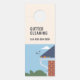 青い空の後ろに、雲と家の屋根と側溝のイラストレーションと一部の紅葉を持つドアハンガー。裏面にはサービスや情報のリストが連絡ある。屋根や樋の清掃や修理、便利屋、圧力洗浄サービスなどの小事業に使用できる。