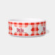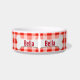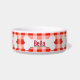 白い犬の骨と犬の名前がキルティングジンガムの背赤と白景に付いている。名前は編集可能。