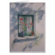 窓辺の鉢植えなゼラニウム、落ちる花びらの水彩画の絵画。 太陽は近くの木および壁および窓の美しい影を作成し、純カーテンのパターンを選ぶことによって輝くです。