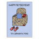 テレビ用のリモコンは椅子の片腕に置かれ、マグは他方に置かれている。「素敵な母に対する幸福な退職」という言葉がイメージに添えられている。