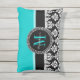 黒いダマスク織の水のモノグラムのパーソナライズな屋外の枕。 Elke Clarkeの©によるデザイン。 あなたの名字およびモノグラムとカスタマイズ。 完全にあなたの装飾用クッションを個人化するにはあなたの屋外の宇宙に一致させるために好んだら背景色およびモノグラム色を余りに変えて下さい
